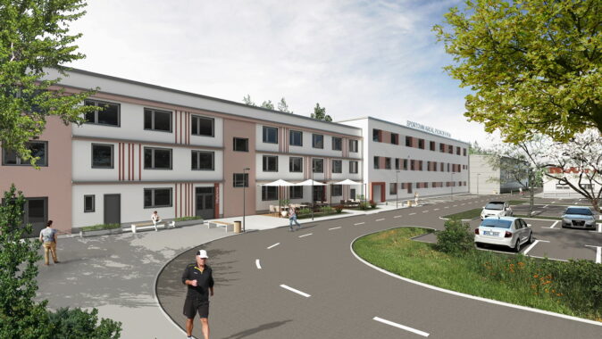 ubytovny a tělocviční haly a nástavbu dvou podlaží s plochou střechou. V