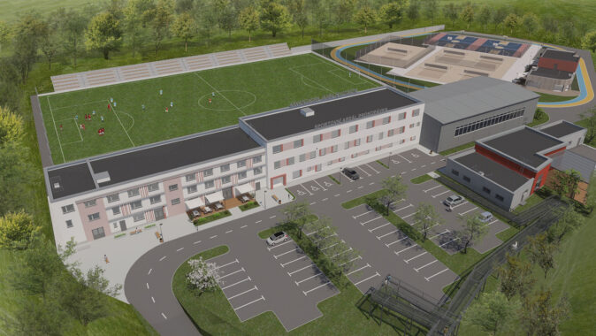 příjezdové komunikace, vznikne také nová malá jednopodlažní tělocvična o