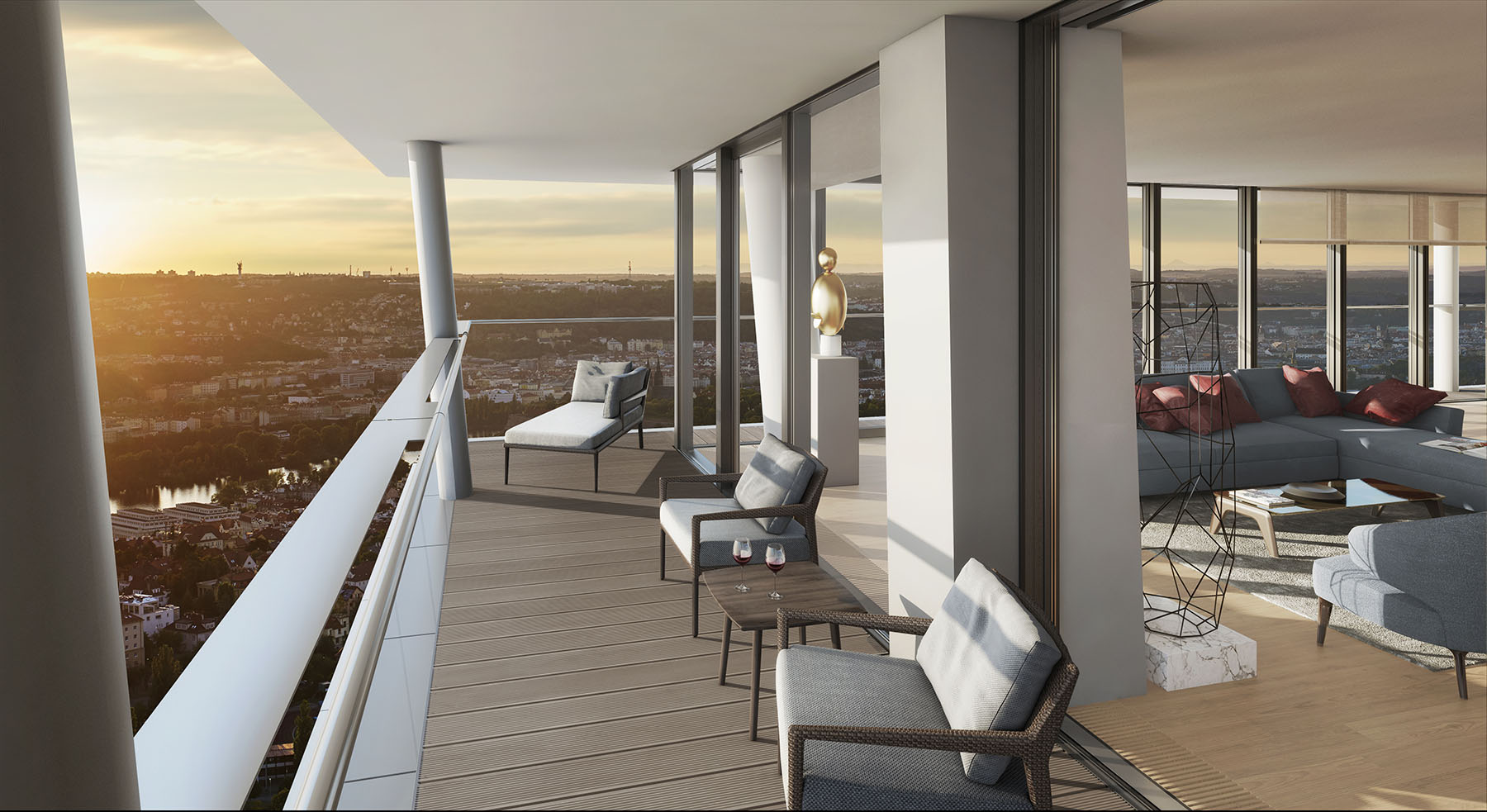 z 30 poschodí se budova rozchází do dvou samostatných věží, čímž je