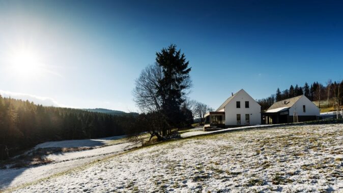 Novostavba rodinného domu stojí na louce nad údolím řeky