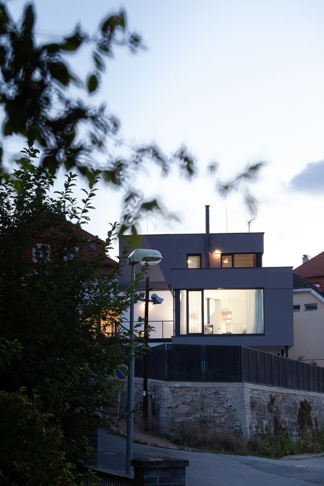 Dům usazený ve svahu v pražské Chuchli. Svým způsobem se