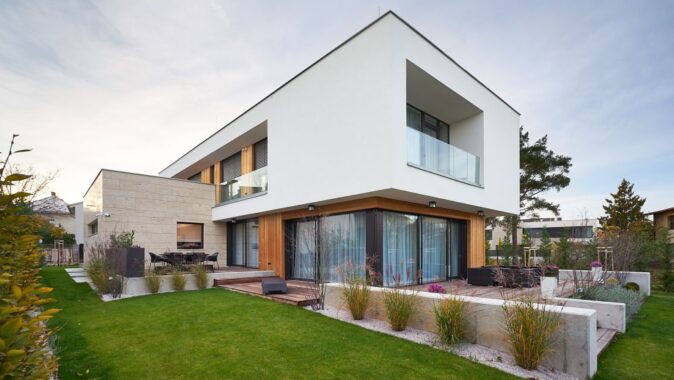 interiér a přilehlou zahradu. Obě části stavby mají plochou střechu, která nad