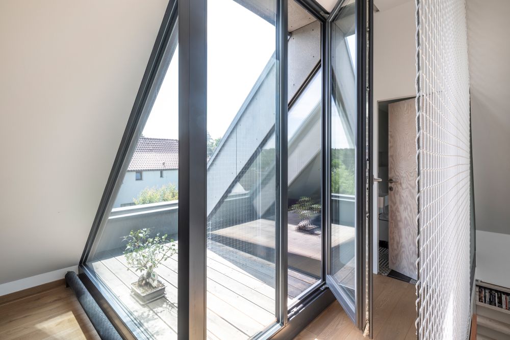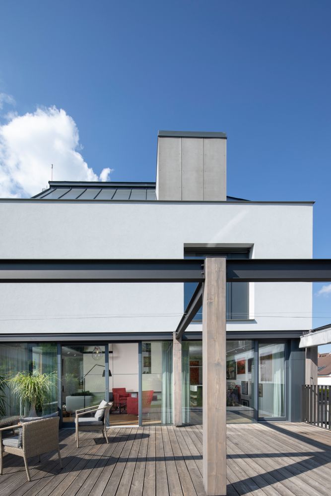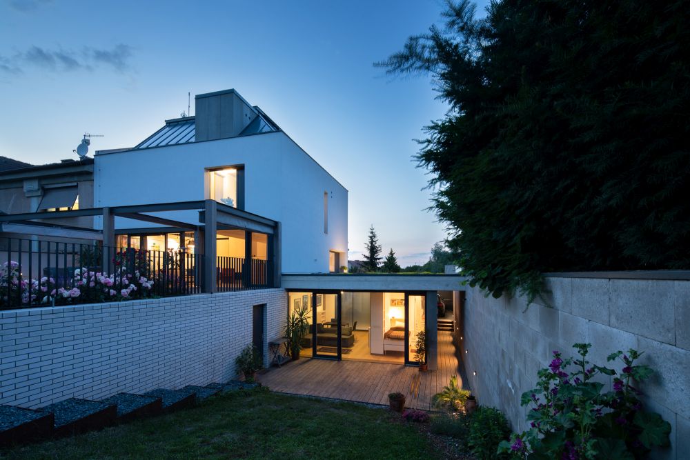 propojena s obytným podlažím otvírajícím se do zahrady přes terasu s pergolou.