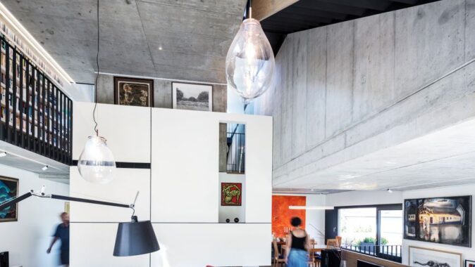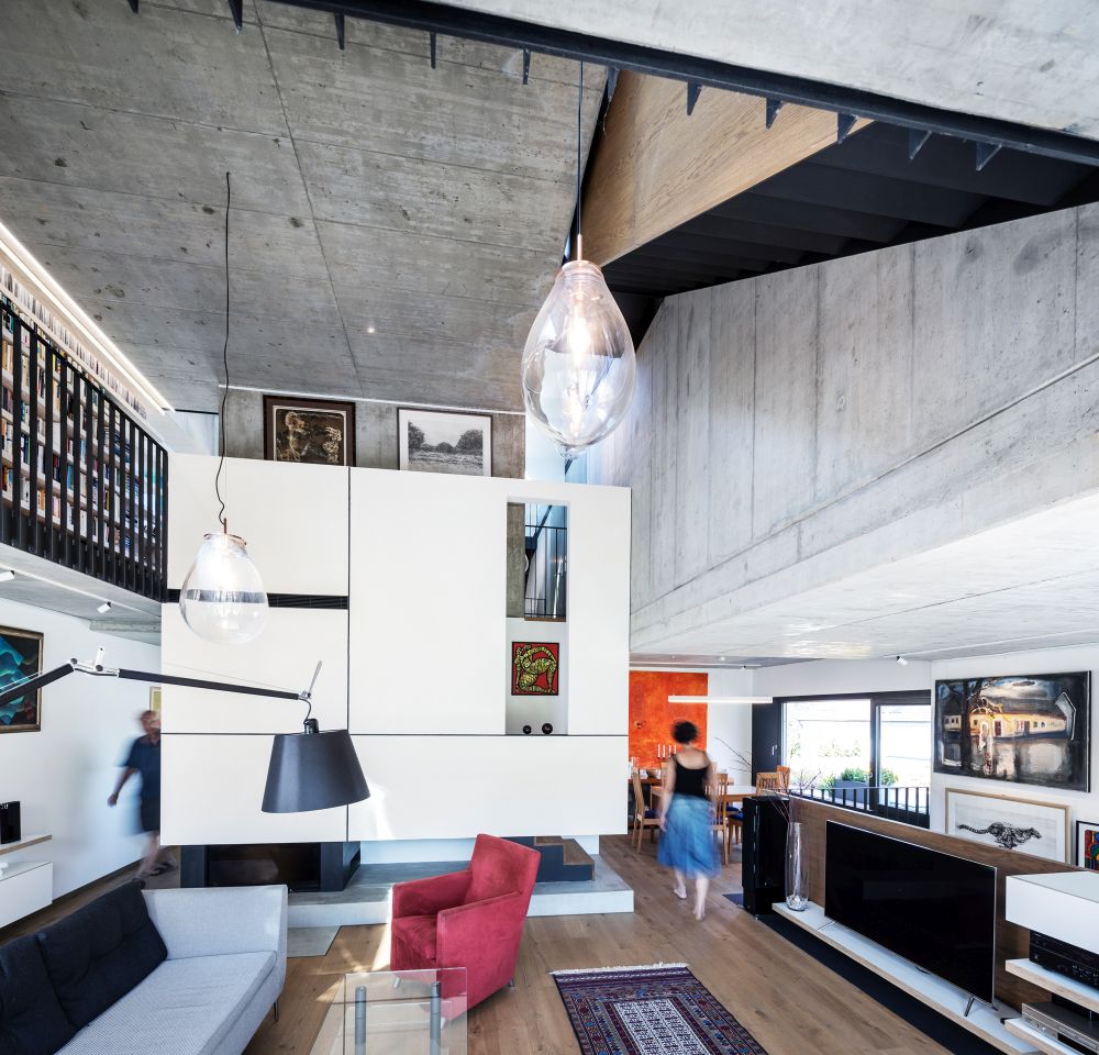 kuchyní, ve vertikálním je lemováno ochozem s knihovnou, z něhož je přístupná
