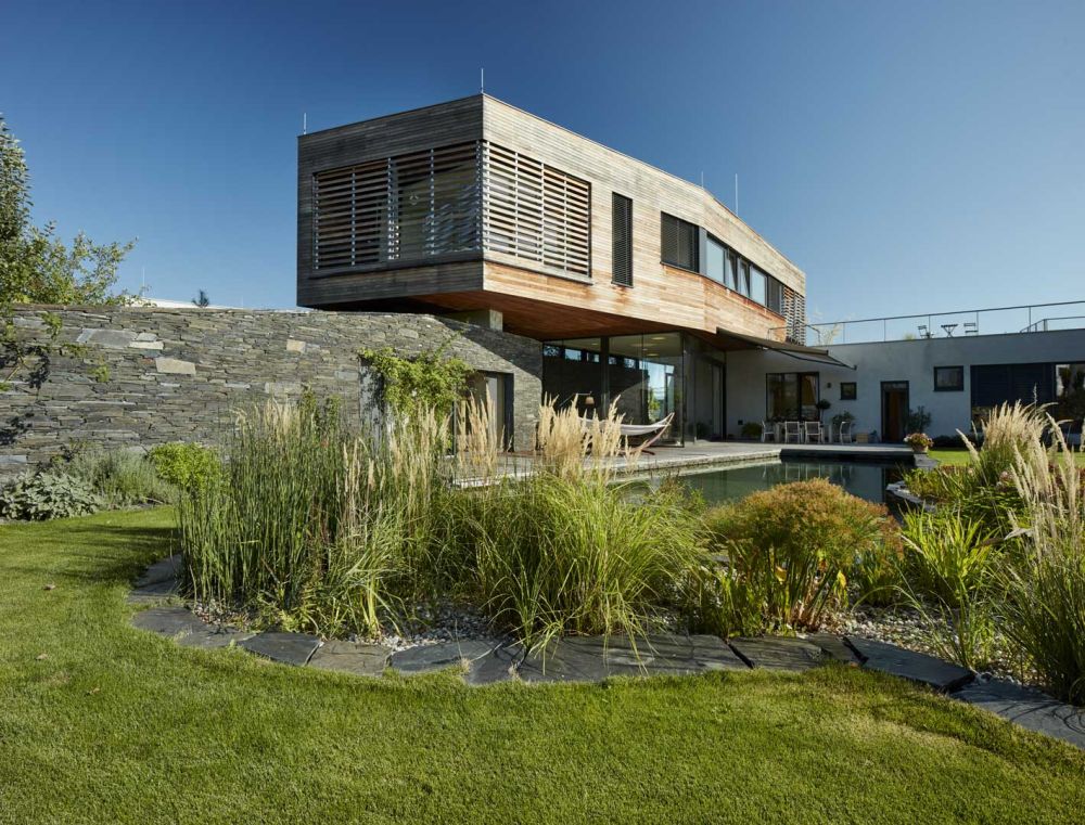 terasa, skalka, koupací bio-jezírko, louka a trávník, platan, břízy a vistárie,