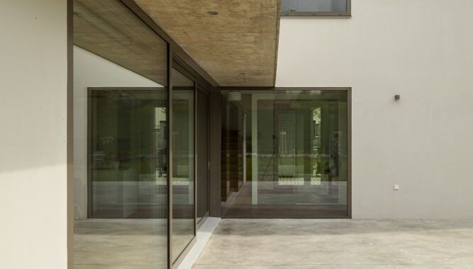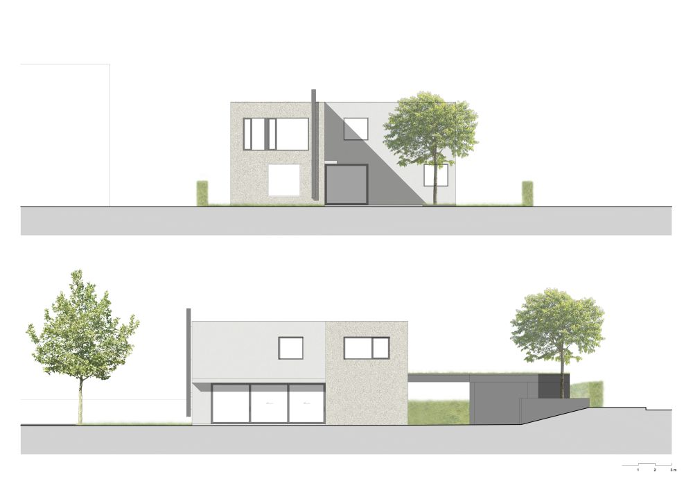 Pozemek domu pro čtyřčlennou rodinu se nachází poblíž řeporyjského náměstí a hřbitova. Charakter okolní zástavby variuje od individuálních rodinných domů v nejbližším okolí přes bytové domy až po starší zástavbu vesnického charakteru. Novostavba respektuje měřítko okolních rodinných domů. Vzhledem k urbánní struktuře a orientaci pozemku jsme navrhli půdorys ve tvaru L, přičemž uliční hrana navazuje na sousední zástavbu. Dům se tak otevírá směrem na západ a do klidné části pozemku s dvorem a zahradou. V přední části pozemku při ulici Smíchovská je umístěn objekt garáže a venkovního stání, který spolu s živým plotem a novým stromem nenápadně odstiňuje rodinný dům od rušného silničního provozu.