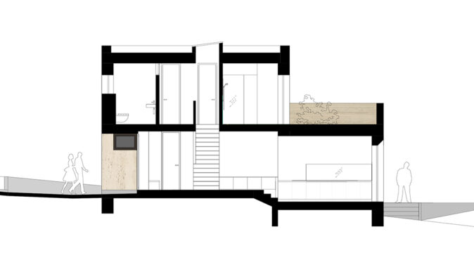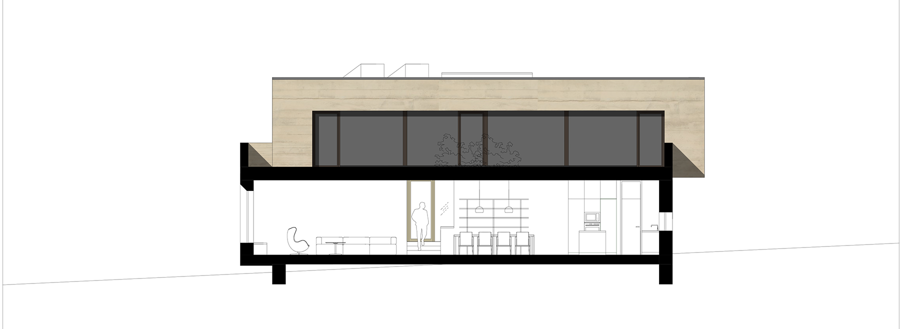 Ve vstupním podlaží se nachází provozovna na výrobu dortů a cukrářských výrobků, s vlastním vstupem. Provozovna je pouze s denním provozem bez rušivých vlivů. Druhou část tvoří obytný prostor s kuchyní, snížený oproti vstupní části,s plynulým přechodem přes terasu do zahrady. Obytná část využívá západní slunce, je zde velké okno se sezením na parapetu. Třetí část tvoří patro rodinného domu. Jedná se o intimní část domu se soukromou střešní zahradou. Jsou tu tři dětské pokoje, ložnice, šatna a hygienické prostory. V centrální části patra je schodiště a společná komunikace, prosvětlená pomocí střešního světlíku a prosklením nade dveřmi v příčce. Všechny místnosti na východní fasádě druhého podlaží mají přímý kontakt s prostornou střešní zahradou.