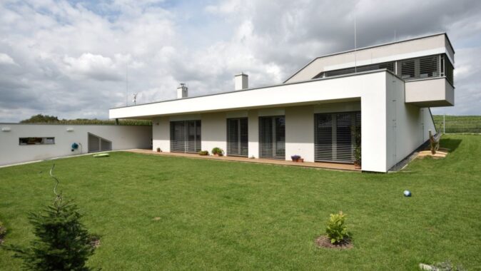 Pro dům je charakteristický pevnostní ráz, inspirovaný nedalekým bunkrem předválečné obranné linie. Expresivní tvary společně s dřevěnou terasou a bílými meziokenními pilíři tvoří kontrast k přírodním liniím koupacího jezírka a k zelené střeše. Celkový výraz domu vzbuzuje dojem do terénu zapuštěné nenápadné a nedobytné pevnosti.