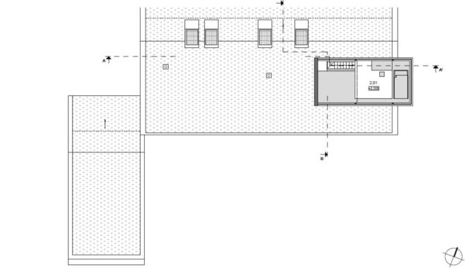 Ve východní části u příjezdové komunikace je zpevněná plocha, na kterou navazuje objekt s garáží, vinným sklípkem a psím kotcem. Vstup do domu je umístěný společně s venkovním krbem pod krytou terasou. Ze zádveří je přístupná šatna a WC, následuje hlavní společenský prostor s provozně odděleným kuchyňským koutem. Funkčně je rozdělen na jídelní a odpočinkovou část s krbem, jídelní část je propojena s krytou terasou. Na obytný prostor navazuje chodba, která slouží také jako šatna. Z chodby se vstupuje do technické místnosti, koupelny s WC a sprchou a do dětského pokoje. Ten je uzpůsoben k rozdělení na dva samostatné pokojíky. V závěru chodby se vchází do ložnice, která je přes šatnu propojena s koupelnou. Zároveň je schodištěm umístěným rovněž v závěru chodby přístupná pracovna, tzv. střešní pozorovatelna, sky box s panoramatickým výhledem do okolí.