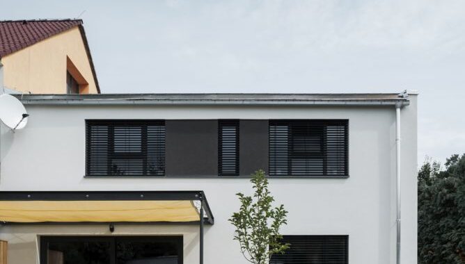 plechová římsa, ve které je schovaný okapový žlab. Zbytek domu je omítnut