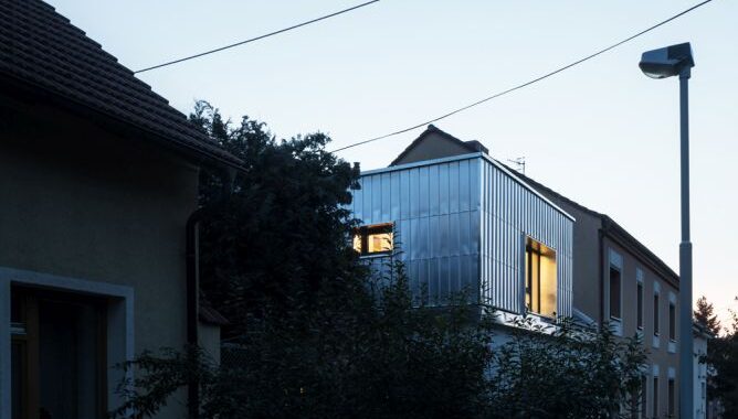 nárožním hliníkovým vikýřem, který udává charakter uliční fasádě a výškově