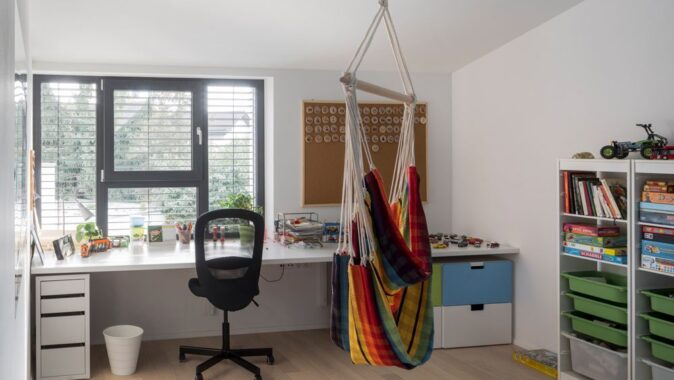 směrem do zahrady pracovna, která je skryta za „tajnými“ posuvnými dveřmi. V