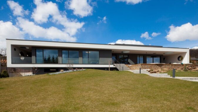 kompletně prosklené průčelí. Rodinný dům může být v tomto případě připodobněn