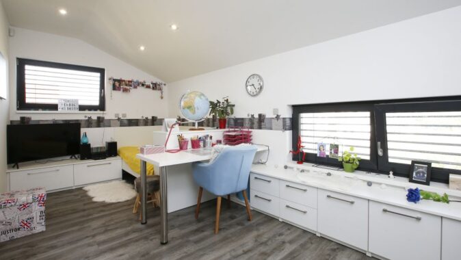 V 1. NP se nachází zádveří s šatnou, technická místnost, obytný prostor, spíž, pracovna se šatnou, herna, koupelna a schodiště. Z obývacího pokoje se vchází na terasu. Ve 2. NP je klidová zóna – skleněná galerie, dva pokoje s šatnami, ložnice s šatnou a chodbou, dvě koupelny. Prostor mezi dětskými pokoji byl rozdělen tak, aby každé z dětí mělo svoji šatnu přístupnou ze svého pokoje. Manželé pak mají svoji vlastní šatnu vedle ložnice.