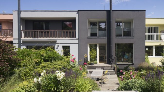Nepoužívané lodžie daly uzavřením vzniknout prostorné ložnici a pracovně s projekčním plátnem, obývací pokoj získal potřebnou dimenzi a naplno se otevřel do zahrady. Směrem ven je dům spíše pasivní, což je podtrženo černou barvou sjednocující veškeré exteriérové prvky s výjimkou dřevěné zahradní terasy. Za černou slupkou domu se skrývá světlý, převážně bílý interiér doplněný mobilními a vestavěnými prvky s vlastním výrazným tvarovým a materiálovým charakterem. Odkazují k prvkům používaným v době vzniku domu formálním i materiálovým řešením. Nejsou „retrem“, ale přepisem původních principů.