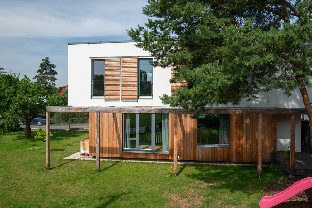 Základní hmoty fasád tvoří silikonová pastózní omítka z části dřevěný obklad ze sibiřského modřínu v zelenomodré barvě. Střecha má dvě úrovně: plochá s krytinou z PVC hydroizolačních pásů a vegetační s extenzivní zelení.