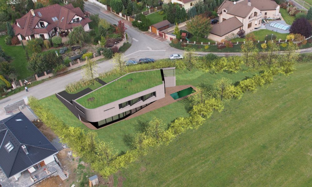 zapuštěné patro, 1. NP je polozapuštěné s otevřenou jižní částí, 2. NP je nadzemní.