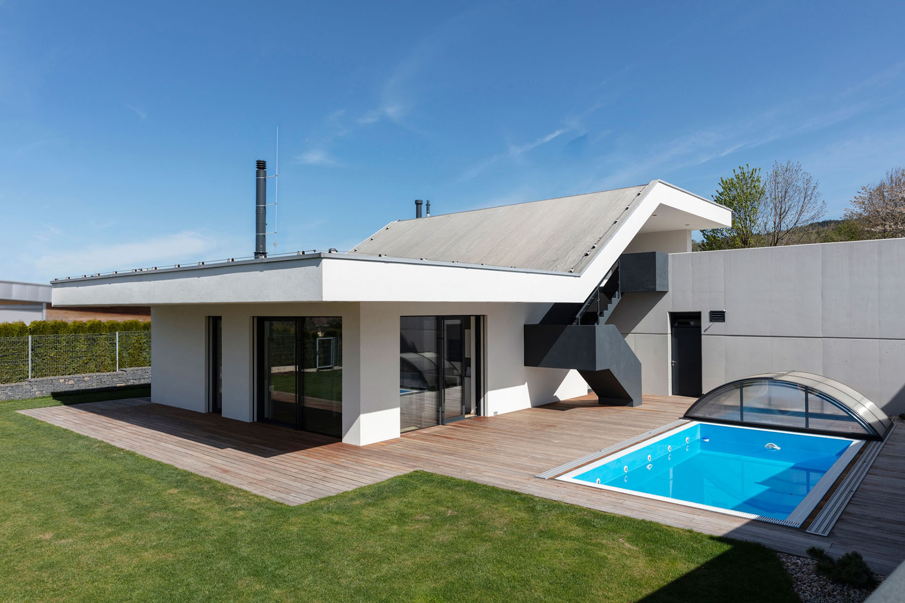 kryto zalomenou střechou. Ta zároveň funguje jako stínící prvek dřevěné