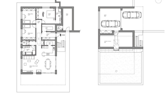 Technická místnost a garáž pro dva osobní automobily byly navrženy do