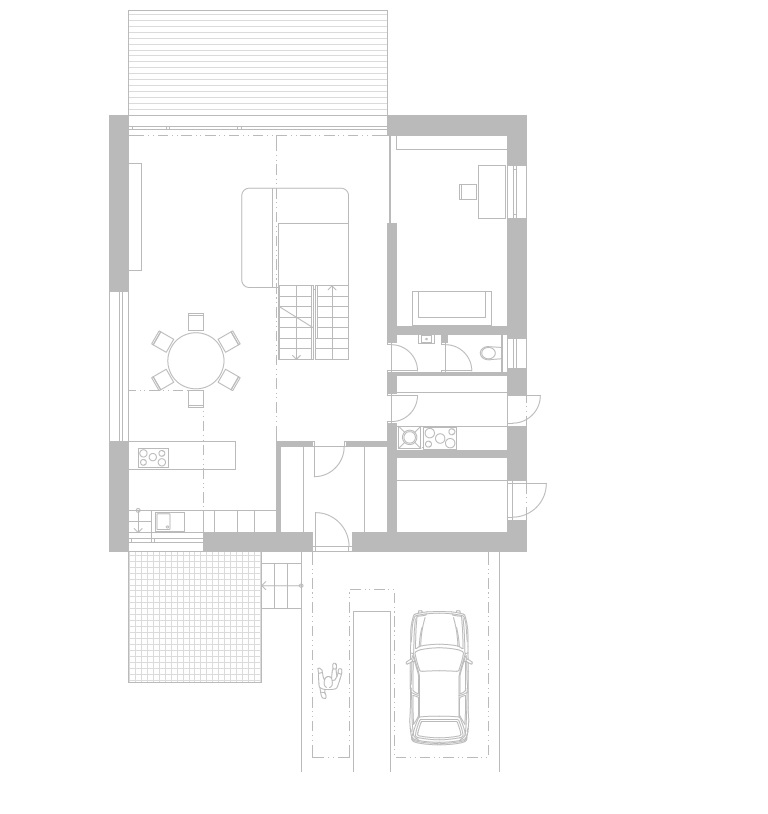 Přízemí domu je koncipováno jako velkorysý volně plynoucí