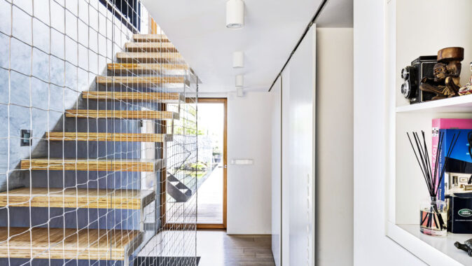 do druhého podlaží, kde dům vrcholí velkým vzdušným obytným prostorem.