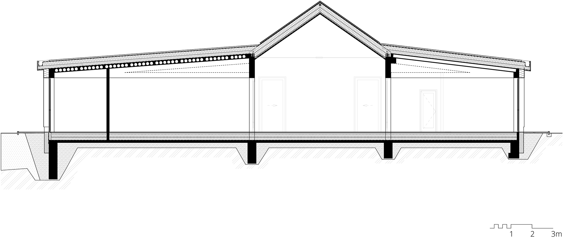 ztužující věnce, které nad okny tvoří průvlaky. Pultové střechy jsou provedeny