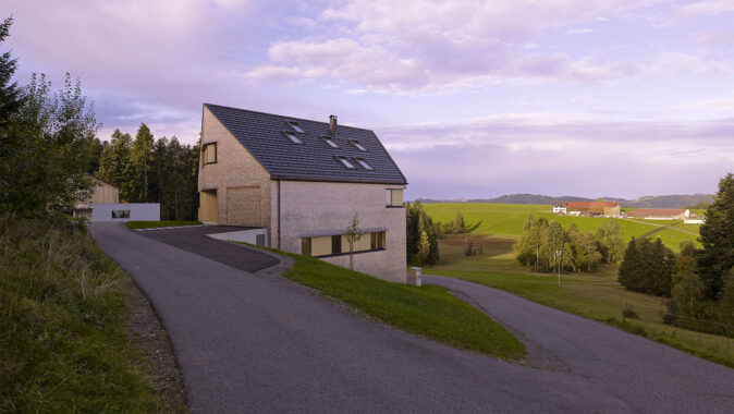 Dolní příjezdová komunikace tvoří vchod pro prázdninové byty přímo nad ním – rovněž přístupný z přízemí a bezbariérový. Privátní obytná zóna rodiny a prázdninové byty jsou tak spojeny – a přesto odděleny. Velikost, tvar střechy a použitý materiál se inspirují vzorem tradičního multifunkčního lesního domu. Zvláště od staré fary v Sulzbergu si architekt vypůjčil tvar budovy a střechy a také proporce.