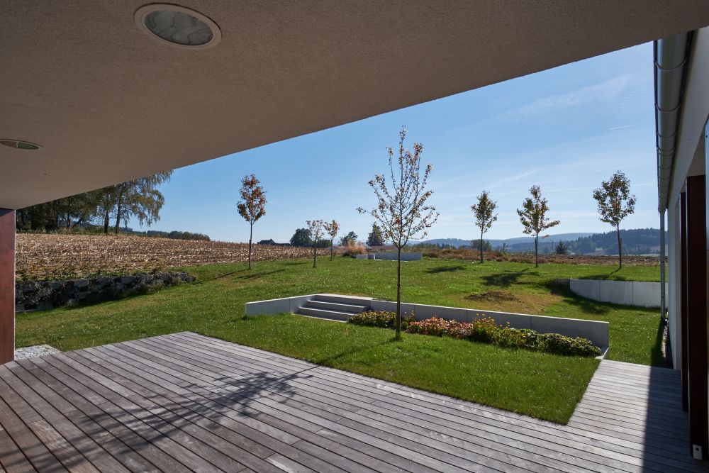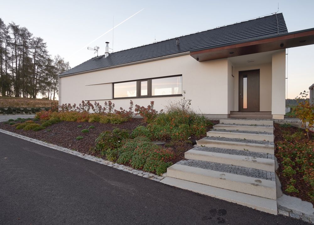 Hlavní motivací klientů, proč odejít z bytu a postavit si dům, byla touha žít v zahradě v kontaktu s přírodou a krajinou. Z této prvotní ideje vychází návrh, v němž se nejdůležitějším prvkem stává pobytová terasa, kterou ze dvou stran chrání dům. Vznikl tak intimní venkovní prostor, který zve k posezení a sledování proměn v zahradě či západu slunce. Hlavní obytná místnost je orientována na terasu. Na severní stranu je obráceno panoramatické okno s výhledem do údolí. Pracovna, pokoj pro dospívající dceru a ložnice jsou orientovány mimo atrium, na západní a jižní stranu. Jde o zachování soukromí jednotlivých členů rodiny a jejich přání, aby nebyli probouzeni východním sluncem.
