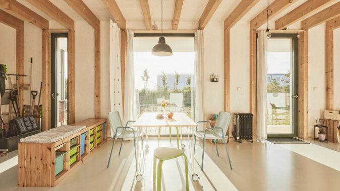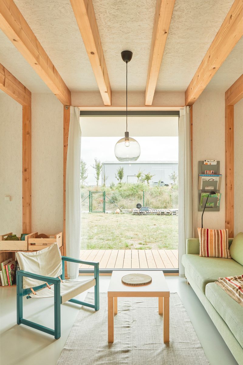 Vstupuje se přímo do obytné haly, která slouží jako zádveří, kuchyně, obývák, jídelna a pracovna. Celý prostor je frázován dřevěnou konstrukcí na stěnách a stropu. Světlý otevřený prostor je maximálně propojen se zahradou. Okna přes celou výšku místnosti směřují jak do zeleně Brdských lesů tak na sousední zónu. V obýváku je v budoucnu možné vyčlenit zónu pro zádveří a pracovní část na konci prostoru. Z hlavního prostoru se jde do minimální chodby 2 m2. Zní je vstup do dětské pokoje, WC s technickým zázemím, koupelna, a dva pokoje.