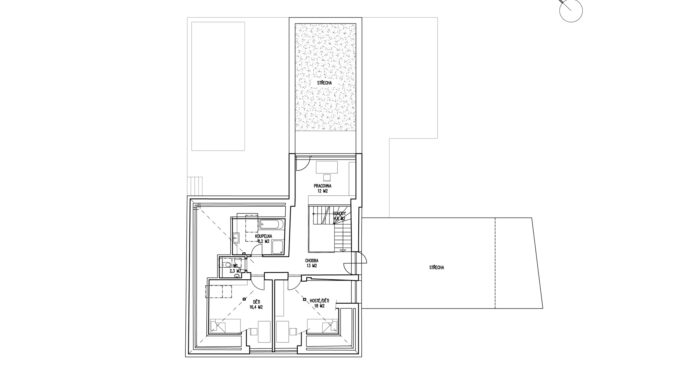 V podkroví jsou nově situovány dva pokoje, koupelna a WC, v hmotě přístavby pak pracovna s velkorysým okenním výkladcem orientovaným do zahrady.