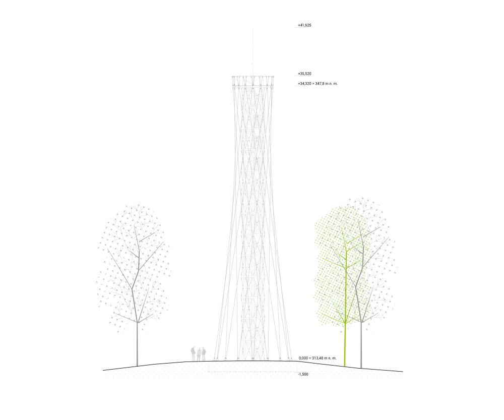 Vzdušnost, transparentnost, otevřenost či průhlednost konstrukcí nechává dovnitř věže vstoupit všechny živly a projevy počasí, díky tomu se nepřeruší kontakt s přírodou ani při výstupu na vyhlídkovou plošinu. Vznikla tak architektonická forma, jež umožní návštěvníkům se postupně ocitat a vertikálně prostoupit jednotlivými patry lesa: od kmenů přes koruny stromů až nad jejich vrcholky.