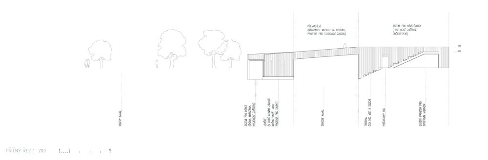 pro diváky. Objekt je průchozí a navazuje v jedné výškové rovině na tribunu a