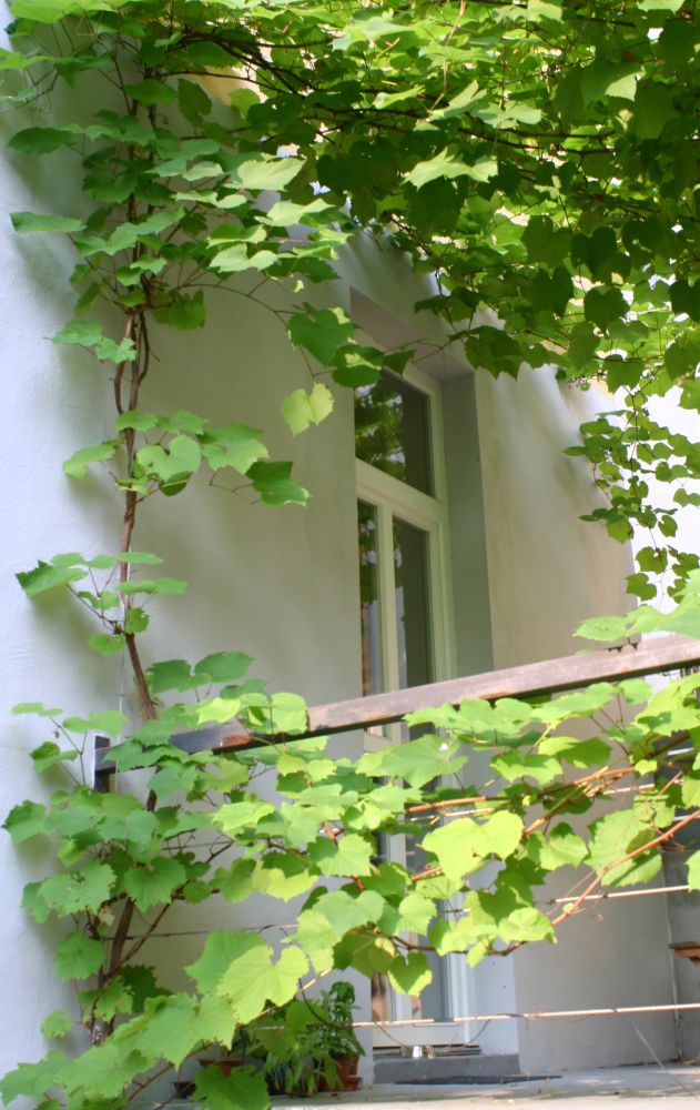 druhy révy nad terasami přízemních bytů, které odkazují na vinařskou minulost
