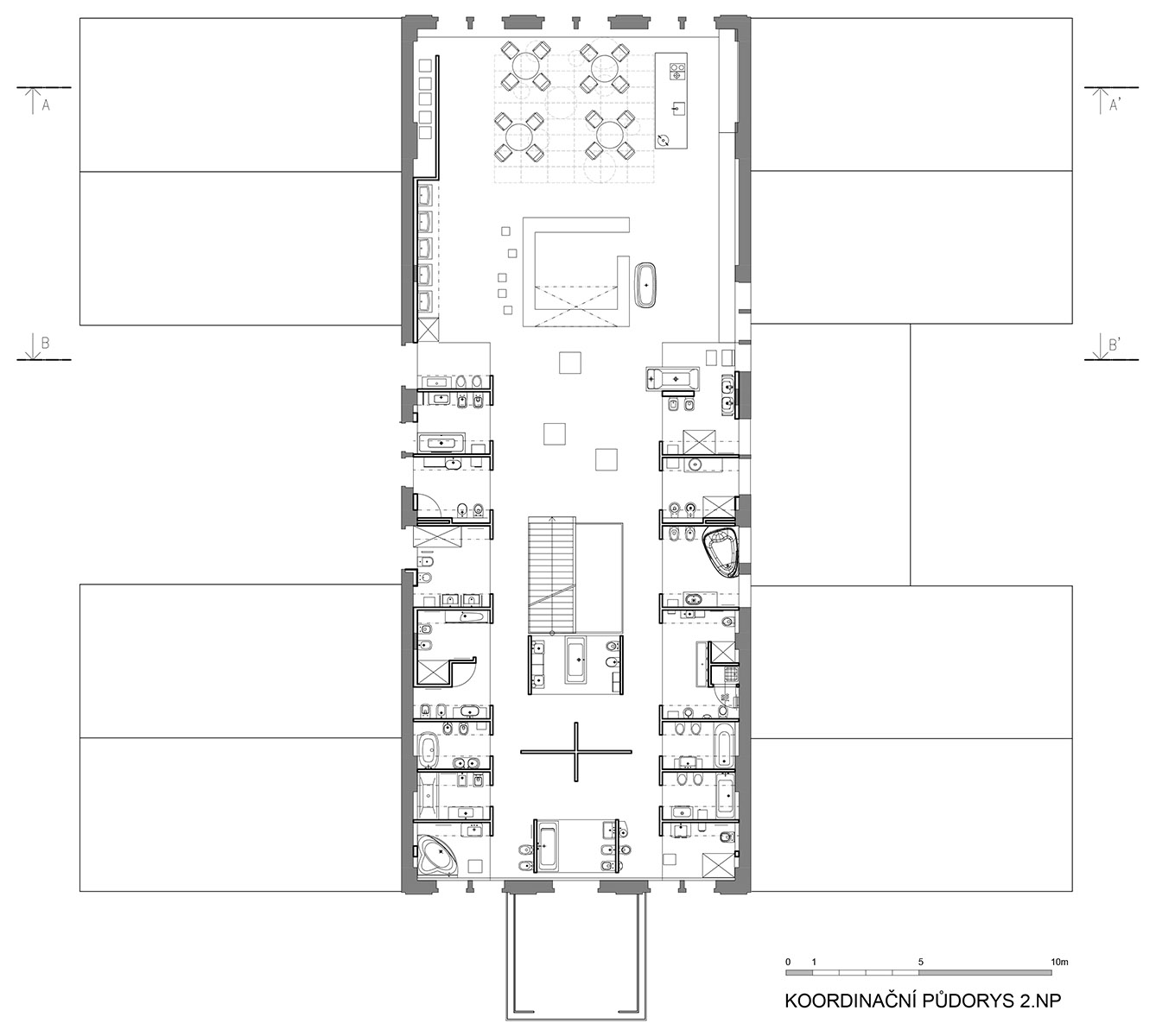 Cílem návrhu bylo vytvořit inspirativní prostředí, které bude funkčně a dispozičně splňovat požadavky investora. Návrh maximálně využívá stávajícího dispozičního řešení. Jednotlivé funkční celky jsou rozděleny do bočních křídel a patra hlavního traktu. Přízemí hlavního traktu a část patra jsou sdíleným prostorem, kde se jednotlivé oblasti prolínají. Zároveň jsou zde jednací místa a hlavní zázemí pro návštěvníky. Vstup jsme na základě několika zpracovaných variant a po konzultaci s investorem zvolili z boku. Toto řešení má několik výhod. Před vstupem je možné vytvořit hodnotný poloveřejný venkovní prostor, který je ze tří stran chráněn objektem a ze čtvrté strany je možné ho jednoduše uzavřít bránou. Další výhodou je, že návštěvník je po vstupu do budovy v samotném centru a ke všem funkčním celkům má stejně daleko. V neposlední řadě je to nejblíže k přilehlému parkovišti.