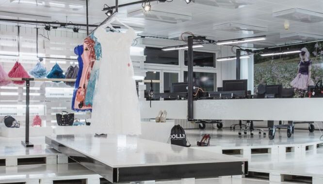 materie. Zbytek dřevěných modulů je volně parafrázován v prostoru a po stěnách.