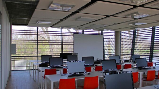 školicí místnosti. Prosklené fasády jsou kolem celé budovy opatřeny horizontálními