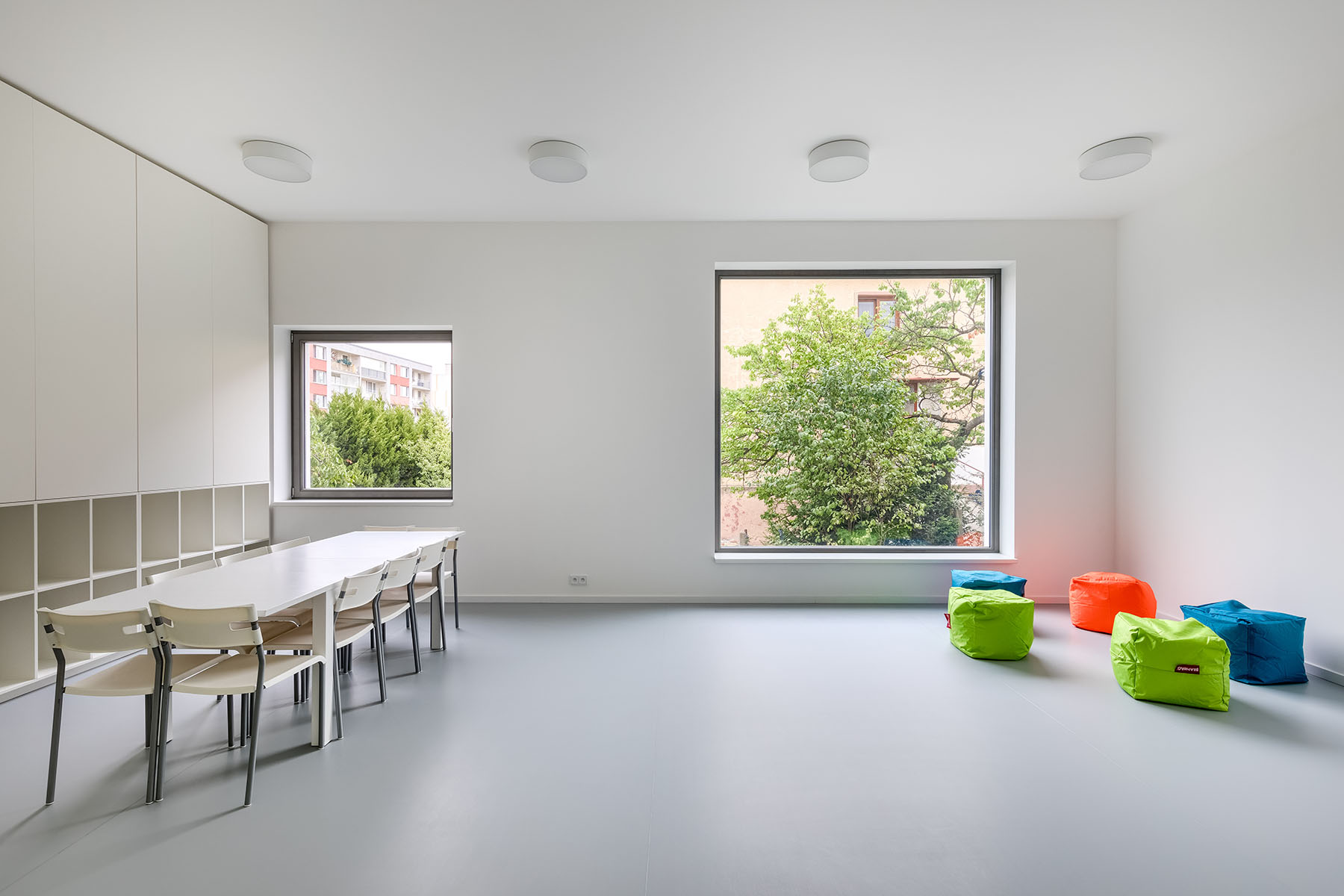 patře jsou klubovny pro žáky a zázemí pedagogů.