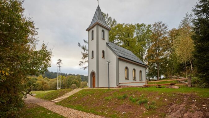 Ruinu kostelíka z roku 1911 se rozhodli manželé Kasperovi opravit v roce 2018 a kaple se postupně začala oblékat do nového kabátu. „Se Slavětínem je naše rodina spjata více než 50 let. Bývalá německá vesnička se vylidňovala a budovy začaly chátrat. Z ruiny kostela jsme nakonec zachránili pouze obvodové zdi. Zbylá část je zcela nová,” doplnil Rudolf Kasper. Nejvýraznějším novým prvkem se v opravené kapli stal kůr z oceli a skla umístěný nad vstupem. Místo oltáře pak zdobí drátěné plastiky sochařky Veroniky Psotkové, která znázorňuje svatého Josefa, jak drží Ježíška. Před samotnou kaplí se nachází nepřehlédnutelné osmimetrové nerezové dílo – lilie, atribut sv. Josefa od sochaře Michala Gabriela. „Cílem rekonstrukce bylo vybudovat výstavní a koncertní prostor, který si ponechá genius loci původní historické stavby, ale zároveň se v něm promítne současná architektura a umění,“ dodal Jan Kunze, programový ředitel Art Point a ředitel EPO1.