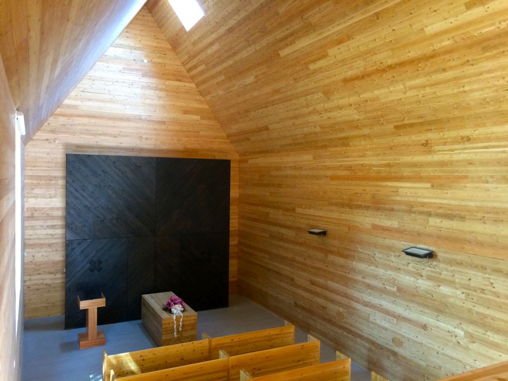 Uprostřed síně jsou dřevěné lavice. U obřadu, kdy rakev zajíždí do zázemí, jsou