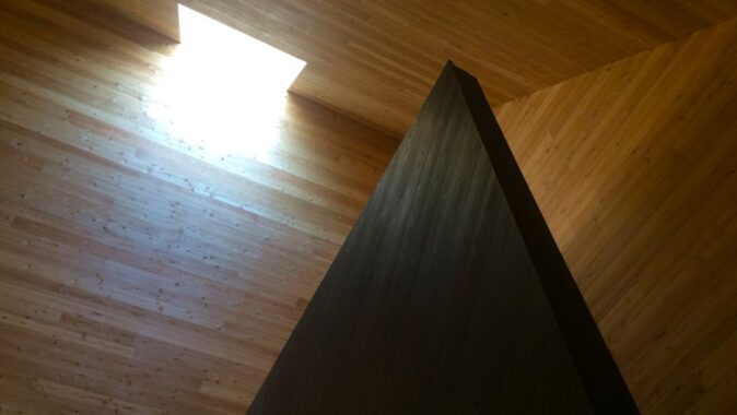 Stěny, strop a balkon interiéru jsou obloženy palubkami z modřínu, z
