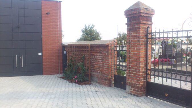 Materiálové řešení odráží sousední prvky – pohledovou cihlu a černou barvu kovaných hřbitovních vrat. Třetím materiálem je dřevo, které je použito na mobiliáři –venkovních a vnitřních lavicích a trelážích pro popínavé růže. Pro jednoduchý interiér síně je charakteristické nepřímé denní a umělé osvětlení.