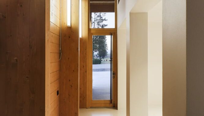dřevěnými rámy. Plné dveřní výplně jsou atypické dřevěné, obložené černým