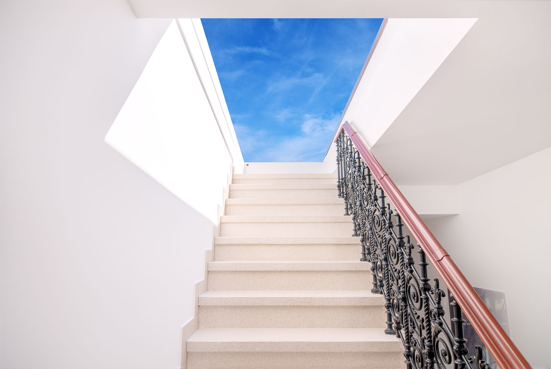 schodišti s příjemným sklonem, dostatkem podchozí výšky a čistým