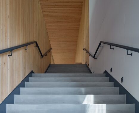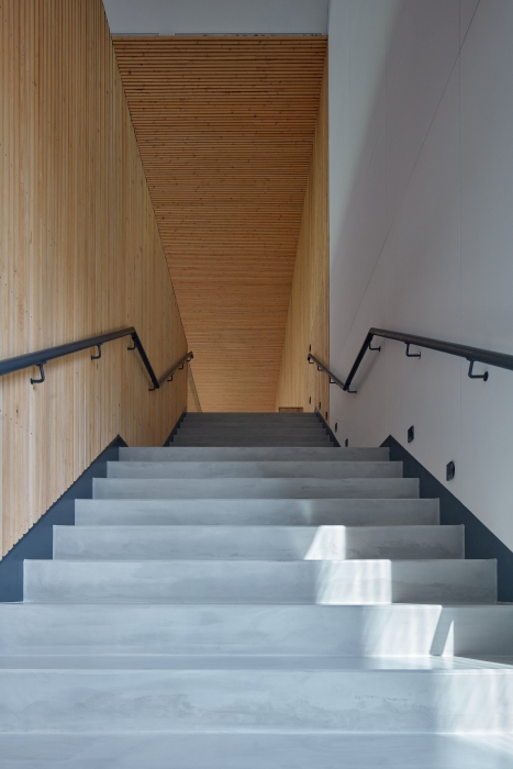 Východní stěna haly má tři velkorysá okna, která rámují cílené pohledy ven i dovnitř. Nejnižší okno láká veřejnost k nahlédnutí a jeho vnitřní kovové lemování slouží k posezení necvičících žáků. Další dvě okna jsou přístupná z vnitřní tribuny a lze jimi dohlédnout na centrum obce nebo sledovat projíždějící vlaky. Celému prostoru vévodí velkorysá lezecká stěna vytažená nad podhled s horním světlíkem. Při zdolání stěny mohou lezci pohlédnout do krajiny úzkým oknem ve štítu. Druhý světlík dotváří celou kompozici. Venkovní rohy těchto světlíků zvědavě vystupují nad střechu a rozehrávají jinak rigidní formu haly. Snaha zapadnout ale i vyčnívat se tak mísí v celém návrhu, který se pokouší o novou otevřenou typologii sportovní haly. Budova svou architekturou podporuje a inspiruje místní komunity a jejich děti. Po několika měsících provozu se začínají plnit sportovní kluby a vznikají nové, například lezecký kroužek.