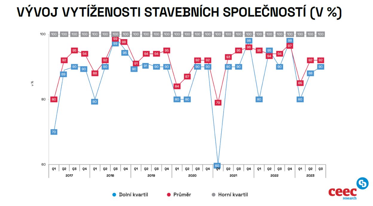 Kapacity stavebních společností pokračují stále na poměrně vysoké úrovni vytížení (92 %). Vysoká kapacitní vytíženost je v této době, kdy jsou predikce směřovány spíše směrem dolů, dána několika faktory. Jedním z faktorů jsou kontrakty, které byly nasmlouvány z dřívějších let, nebo nedostatek pracovní síly, kde i přes snahu stavebních společností na pracovním trhu není možné sehnat kvalifikovanou pracovní sílu, a tím rozvíjet své kapacity. Některé stavební společnosti v době ekonomické nejistoty do vlastních kapacit vysloveně odmítají investovat.