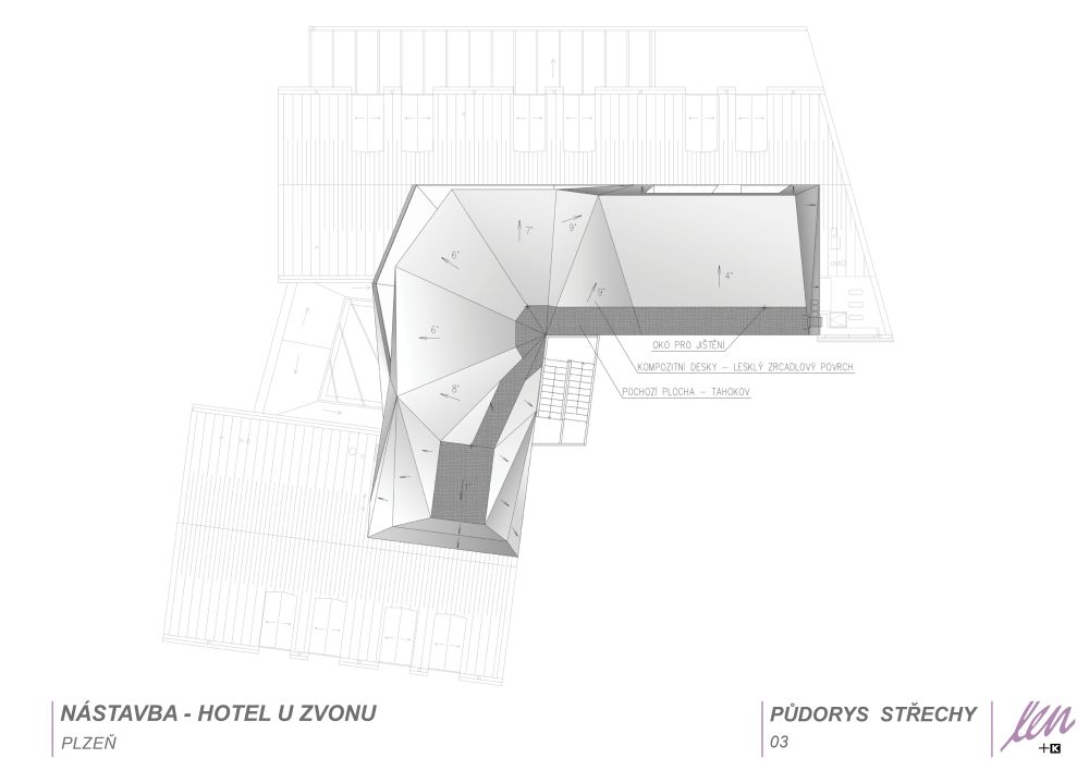 Nad hotelem U Zvonu v Plzni vznikla nástavba apartmánu, kterou architekt Robert Leníček navrhl jako tvarově bohatou hmotu složenou z trojúhelníkových segmentů. Její plášť se stále mění v závislosti na počasí – má zrcadlící obklad, takže střízlivému a jednoduchému domu dodává dynamiku. Přesto je tato ojedinělá nástavba, řešená v duchu novodobého kubismu, v souladu s okolní střešní krajinou.