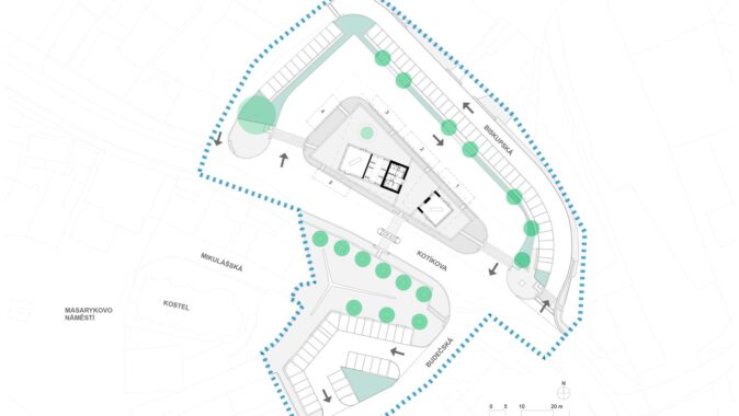 Urbanistické řešení vychází z kontextu místa, tj. ze struktury, podlažnosti a typu funkčního využití sousedního území. Projekt doplňuje odbavovací budovu budoucího Terminálu hromadné dopravy podél ulice Kotíkova, která navrženým umístěním uzavírá uliční frontu, svým zalomeným tvarem reflektuje přirozený tvar ulice a zachovává důležitý průhled na okolní památky. Dále se vytváří nová ulice Biskupská, která se zapojuje do struktury sídla a zlepšuje jeho průchodnost.