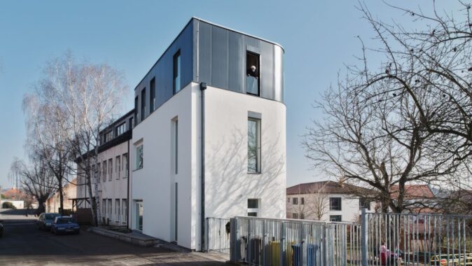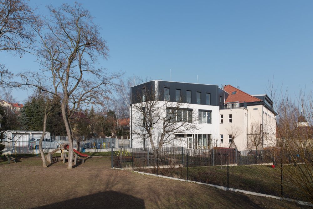 Školní pozemek disponuje znatelně se zužujícími proporcemi západním směrem, měly být zachovány co největší volné plochy zahrady. Výsledná prostorová podoba přístavby reaguje svým přitočením k ulici na požadavky minimální zastavěnosti pozemku. Segmentovým nárožím v zahradě umožňuje plynulou přístupnost nového vstupu do mateřské školy. Nedochází tedy ke křížení provozů. Problém návaznosti přístavby na historickou budovu se podařilo vyřešit z ulice použitím shodného materiálu v obkladu horní části přístavby a navazujícího vikýře ve střeše původní budovy.