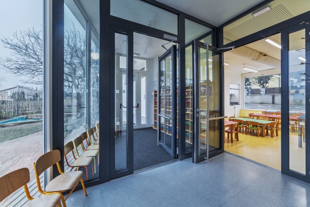 Hlavními materiálovými znaky celého komplexu je rozdílnost ve vnímání struktury. Historická budova byla upravena a adaptována pro provoz sedmi tříd. Doplněna byla o technologie, na které je v současné době kladen důraz – například kvalitní řízené větrání učeben. Přístavbu jsme naopak pojali jako novou strukturu s elementárními prvky: hladká bílá omítka a opláštění nejvyššího podlaží tepelně izolačními panely, které se zakusují do historické budovy a dávají najevo svůj distanc.