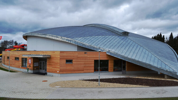 zázemí, šatny a gastro provoz. „Dokončujeme dřevěný obklad fasády, bazénovou